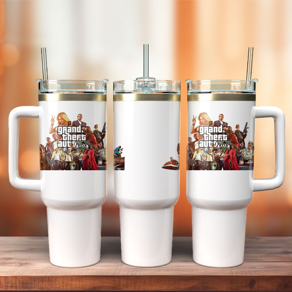 Details: Bring your love for gaming and the great outdoors with the Grand Thef Auto 5 Game Custom Stanley Quencher 40oz Stainless Steel Tumbler. This durable tumbler keeps your drinks hot or cold for hours, perfect for long gaming sessions or relaxing in nature. The stylish design features your favorite Grand Thef Auto 5 characters, making it a must-have for any gamer.