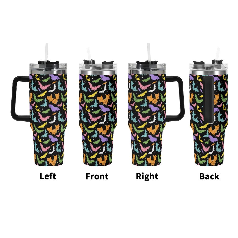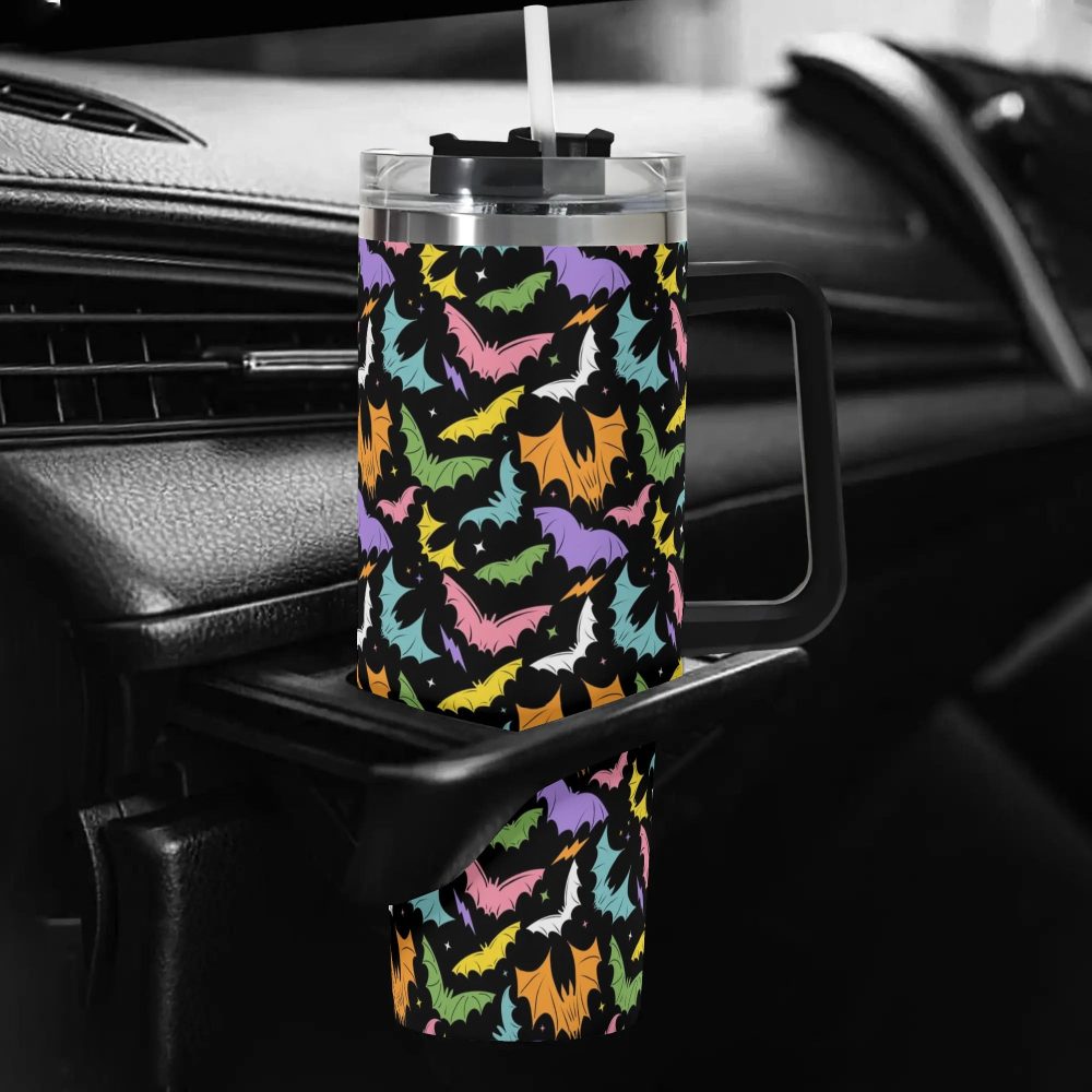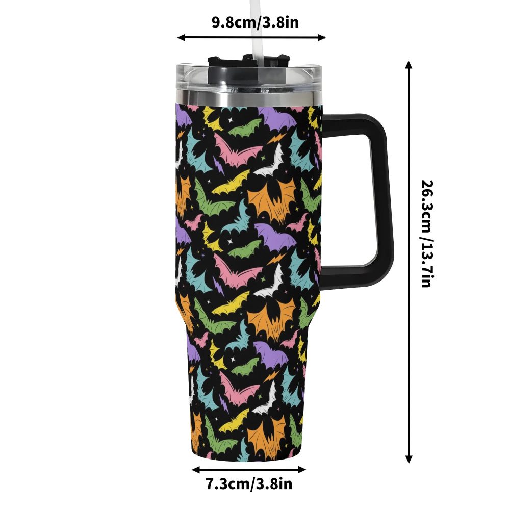 Details: Embrace the spooky season with our Halloween Batty Bats Custom Stanley Quencher 40oz Stainless Steel Tumbler With Handle. This unique tumbler features an eye-catching design of bats flying through the night sky, perfect for adding a festive touch to your daily hydration routine. Made with high-quality stainless steel and a convenient handle for easy carrying, this tumbler is a must-have for any nature enthusiast or Halloween lover.