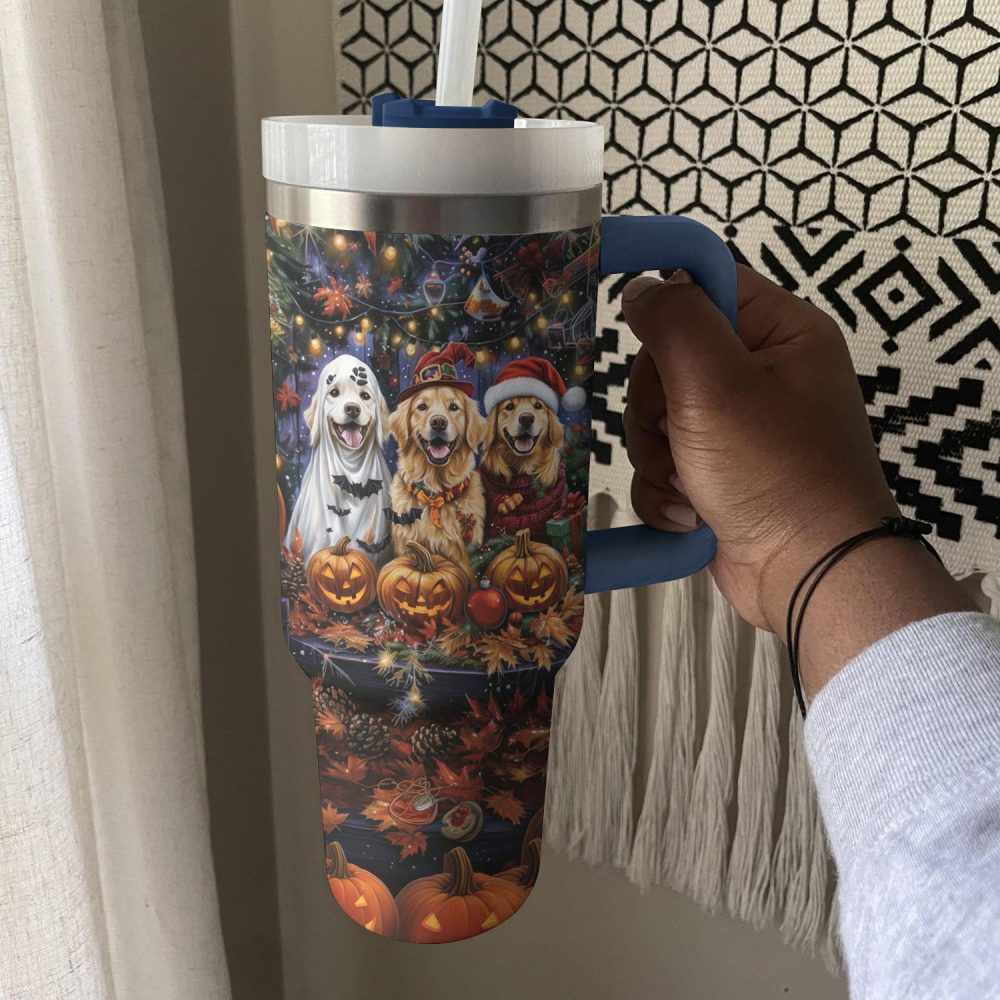 Details: Celebrate the spooky season with our Halloween Festive Golden Retriever Custom Stanley Quencher 40oz Stainless Steel Tumbler With Handle, featuring a charming golden retriever designed specifically for the fall festivities. This durable tumbler keeps your drinks at the perfect temperature for hours and is the perfect accessory for any outdoor adventure or Halloween gathering.