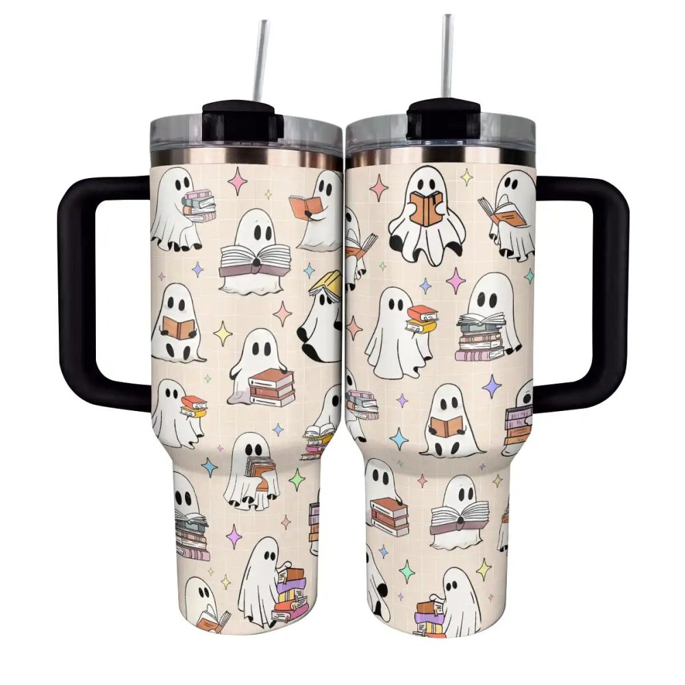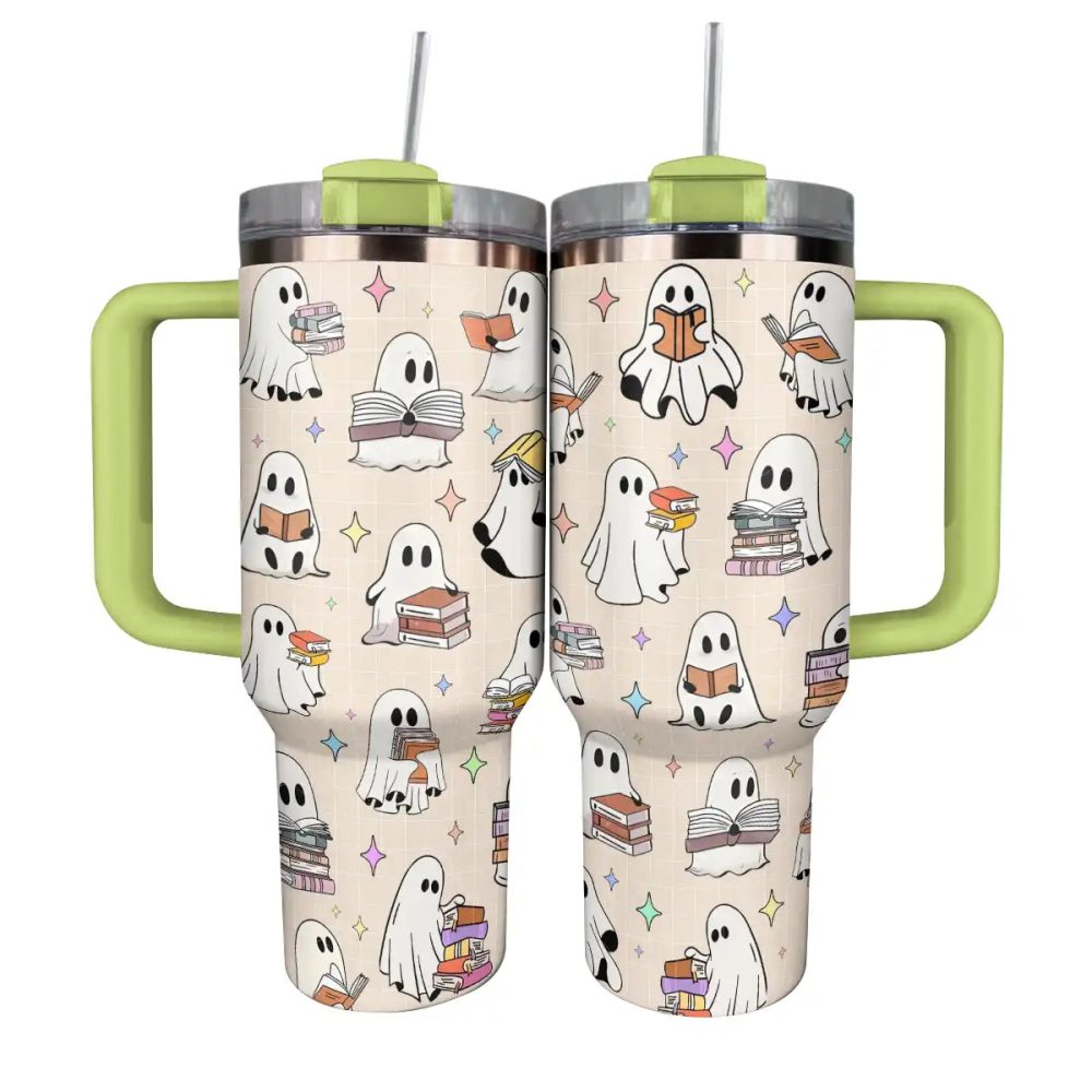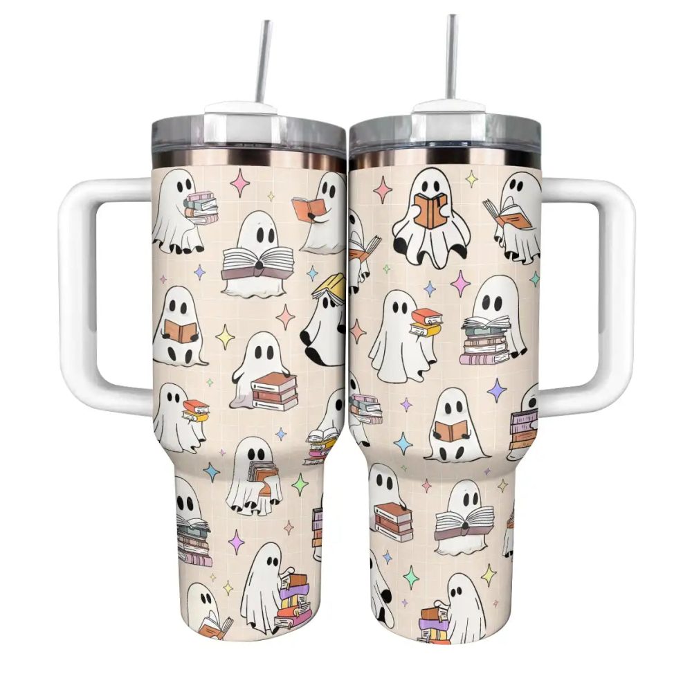 Details: This Halloween-themed tumbler features a charming ghost enjoying a good book in a spooky, autumnal woodland setting. The durable stainless steel construction will keep your drinks hot or cold for hours, while the convenient handle makes it easy to carry around on all your outdoor adventures.