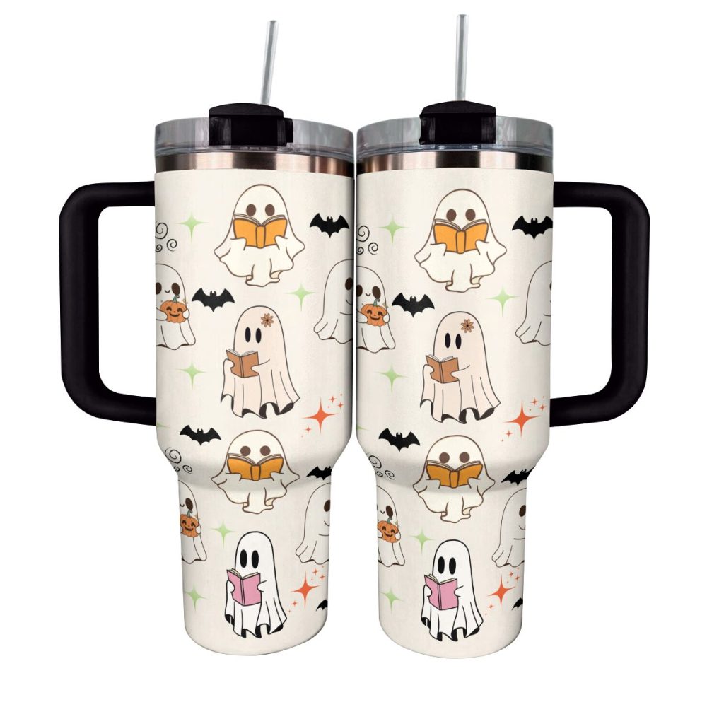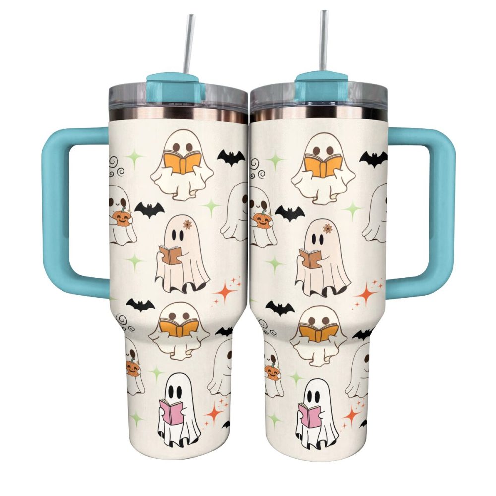 #Halloween, #ghost, #reading, #custom, #Stanley Quencher, #stainless steel, #tumbler, #handle