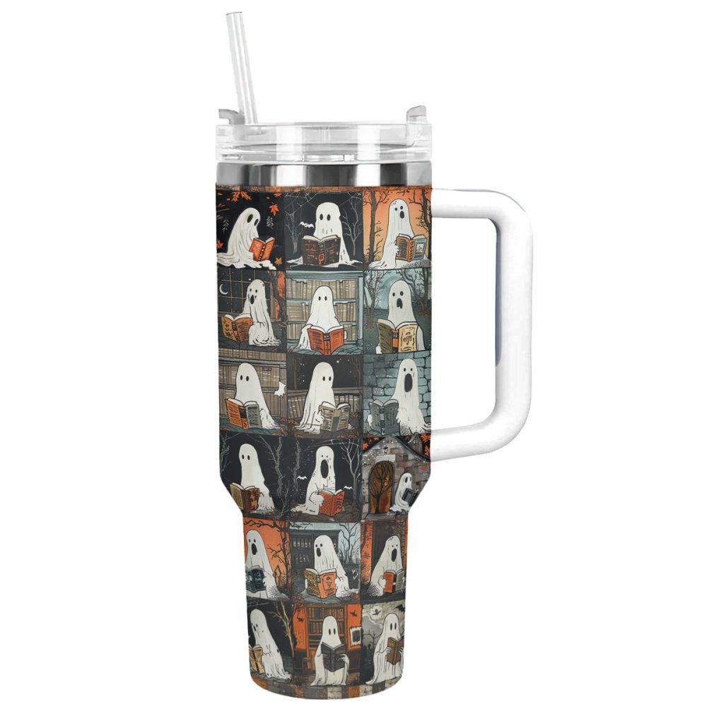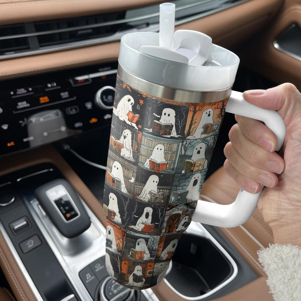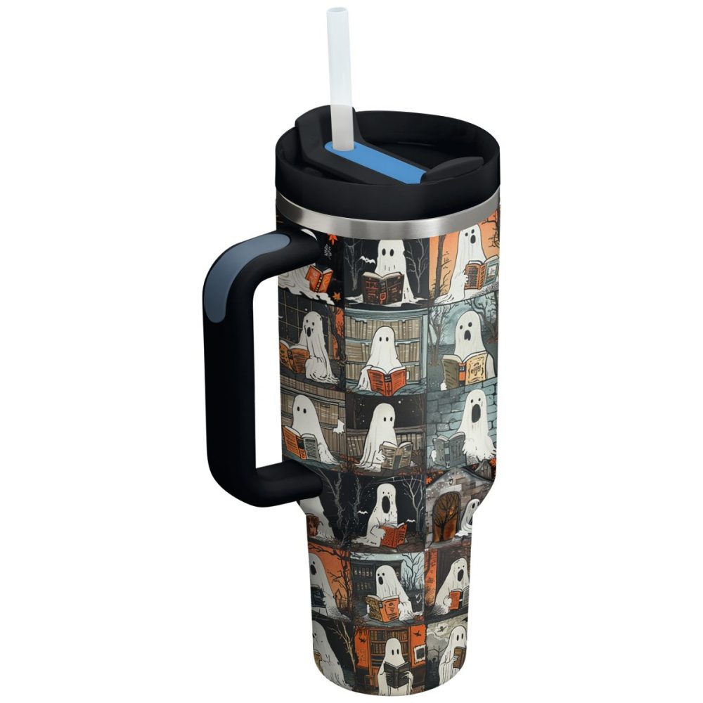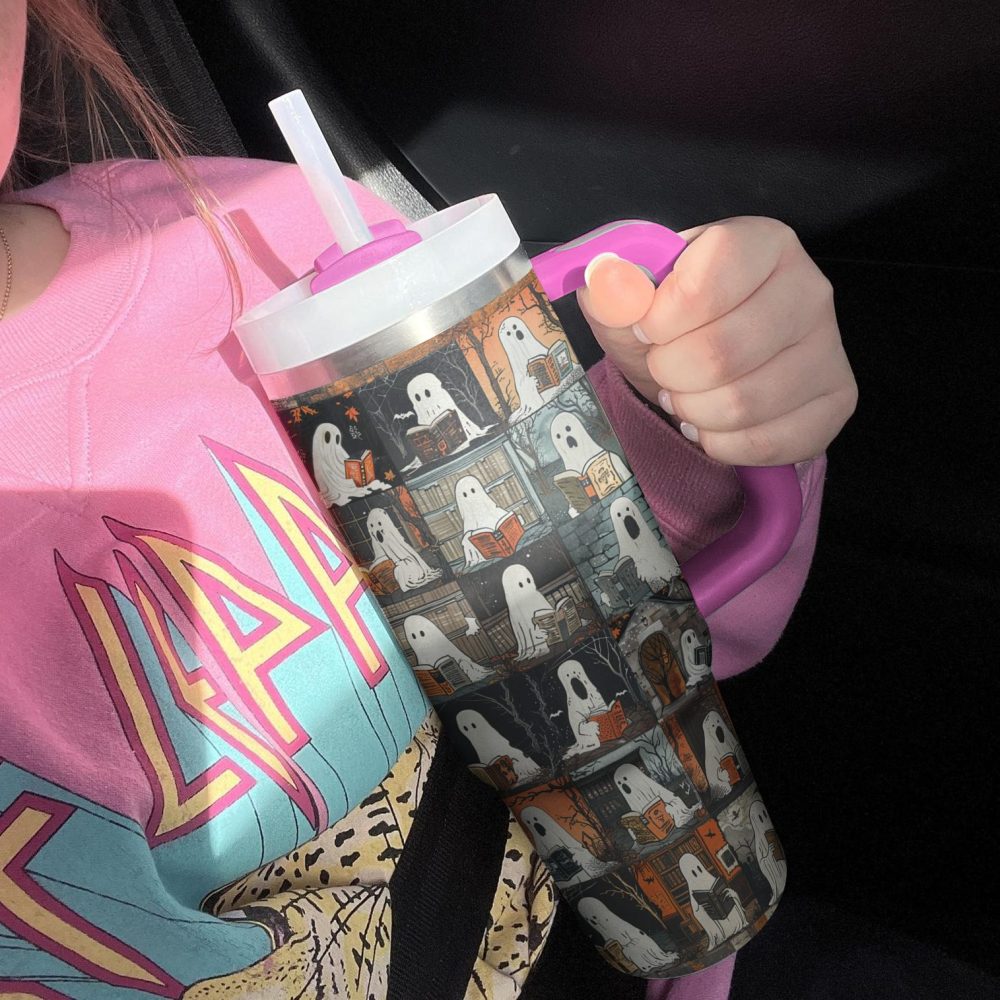 #Halloween, #ghostly, #book club, #Stanley Quencher, #stainless steel tumbler, #ecofriendly, #spooky design, #hot or cold drinks
