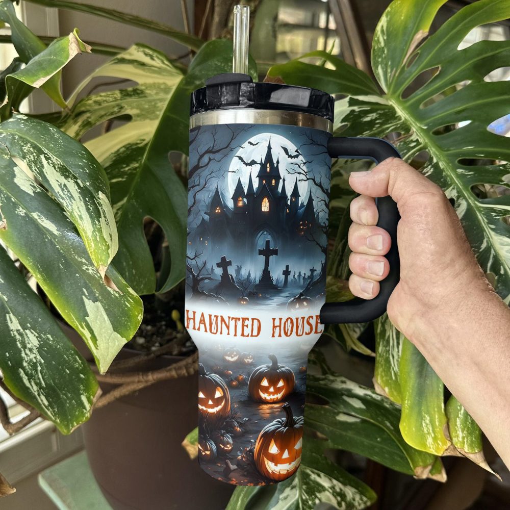 #Halloween, #haunted house, #custom, #Stanley, #quencher, #stainless steel, #tumbler, #handle