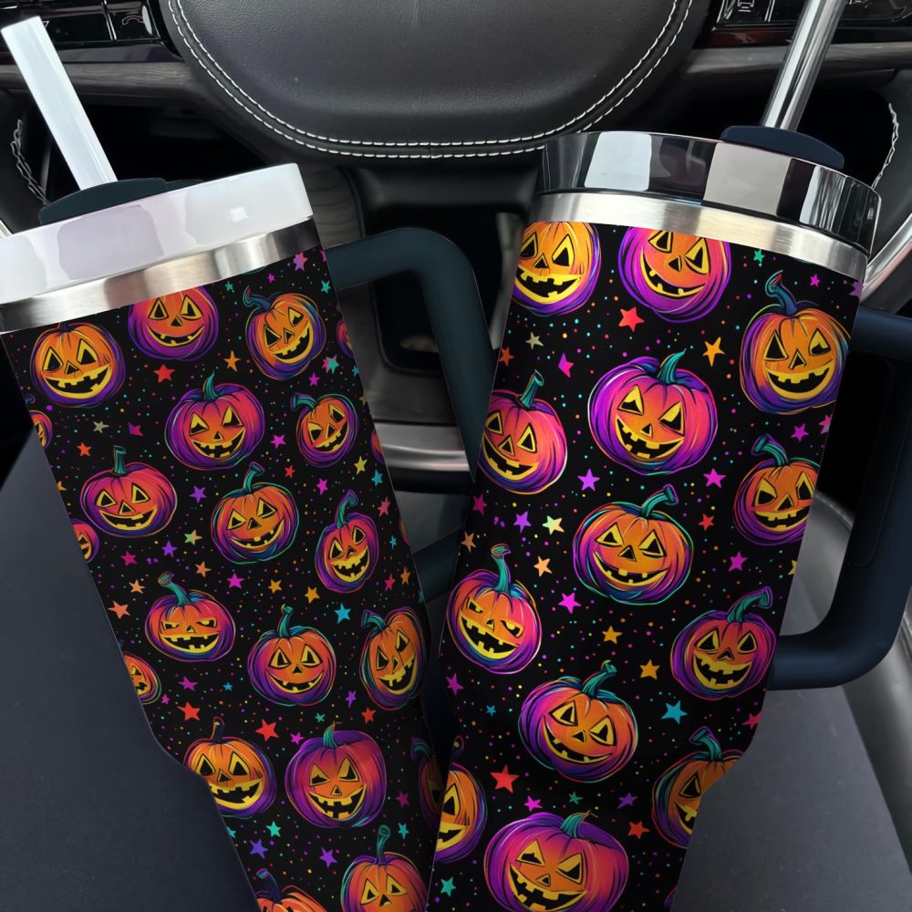 Details: Get into the Halloween spirit with this magical pumpkin themed tumbler that is perfect for parties or everyday use. The Stanley Quencher 40oz Stainless Steel Tumbler with Handle keeps your drinks hot or cold for hours while offering a sturdy and ergonomic design for easy handling. Show off your festive style with this unique tumbler and make your Halloween celebrations even more memorable.