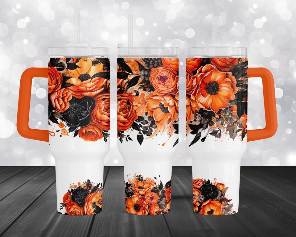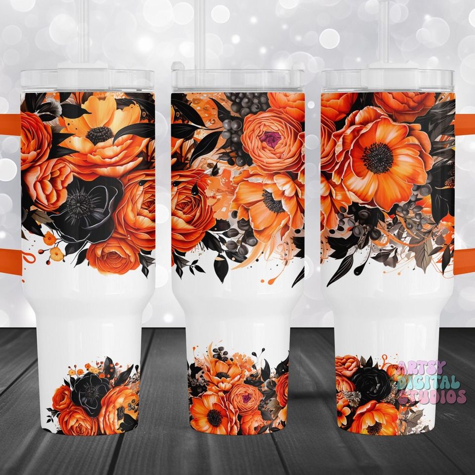 #orange, #black, #flowers, #Halloween, #custom, #Stanley Quencher, #stainless steel, #tumbler, #40oz