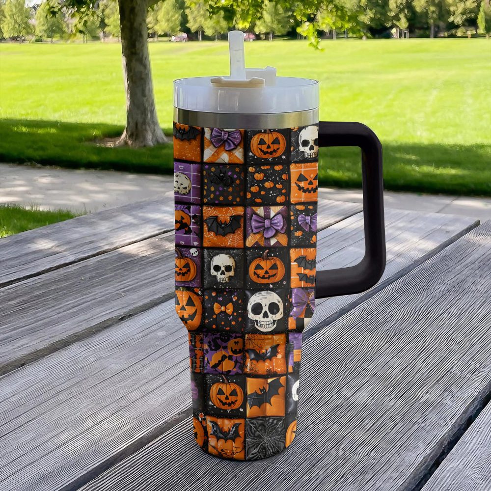 Details: Get into the festive spirit with our Halloween Patchwork Custom Stanley Quencher 40oz Stainless Steel Tumbler With Handle! This stylish tumbler features a unique patchwork design inspired by the colors of fall leaves, making it the perfect accessory for camping trips, hiking excursions, or just sipping your favorite drink in nature.