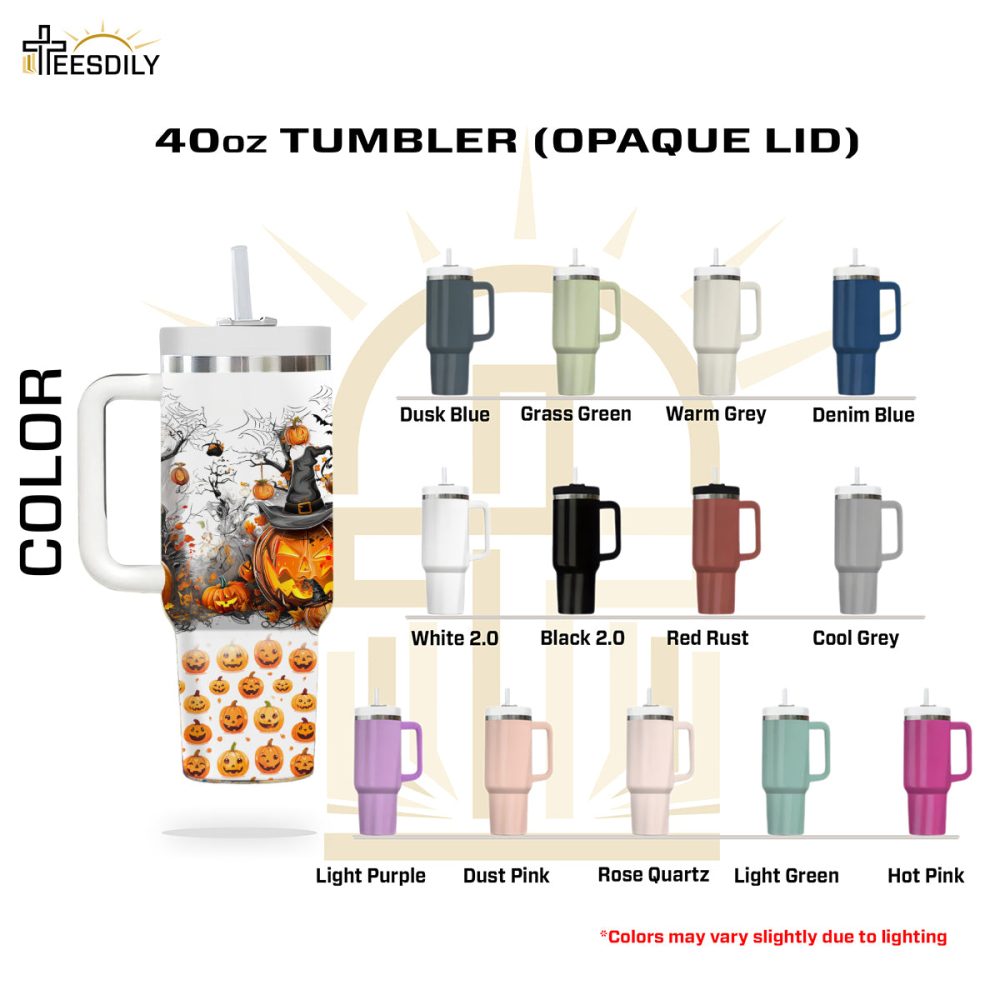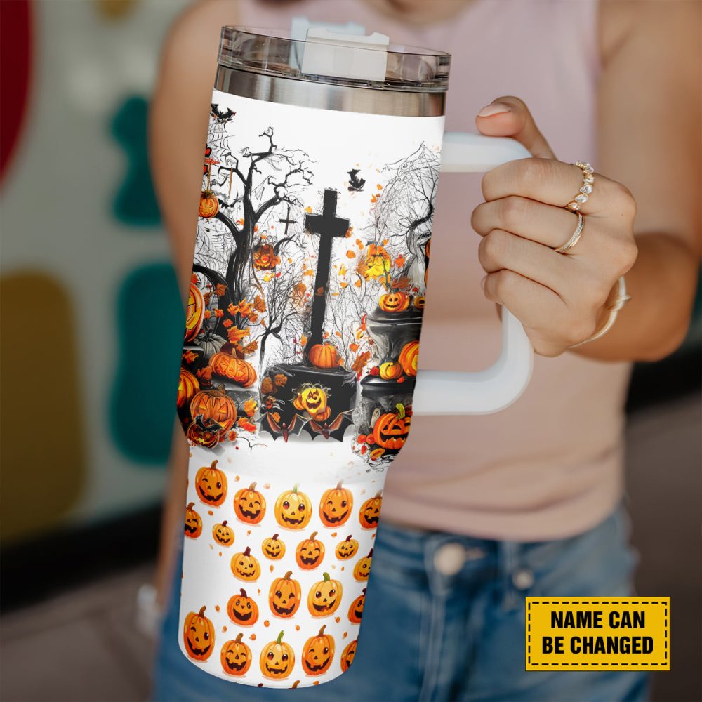 Details: Celebrate Halloween in style with this spooky and adorable pumpkin-themed Stanley Quencher 40oz stainless steel tumbler. The durable tumbler features a custom design of a grinning pumpkin, perfect for toting your favorite drinks on trick-or-treating adventures or cozy nights at home.