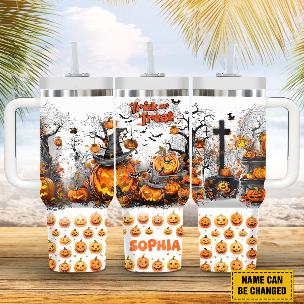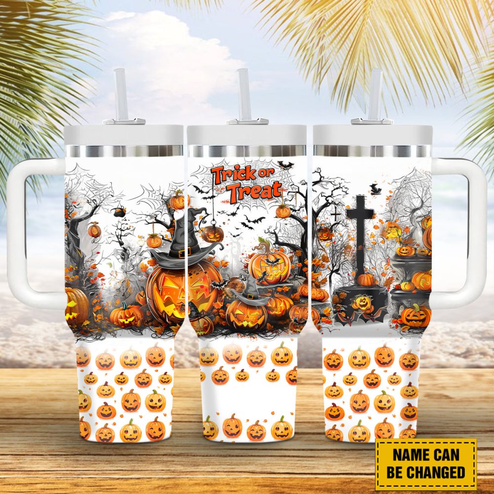 #Halloween, #pumpkin, #trick or treat, #custom, #Stanley Quencher, #40oz, #stainless steel, #tumbler, #handle