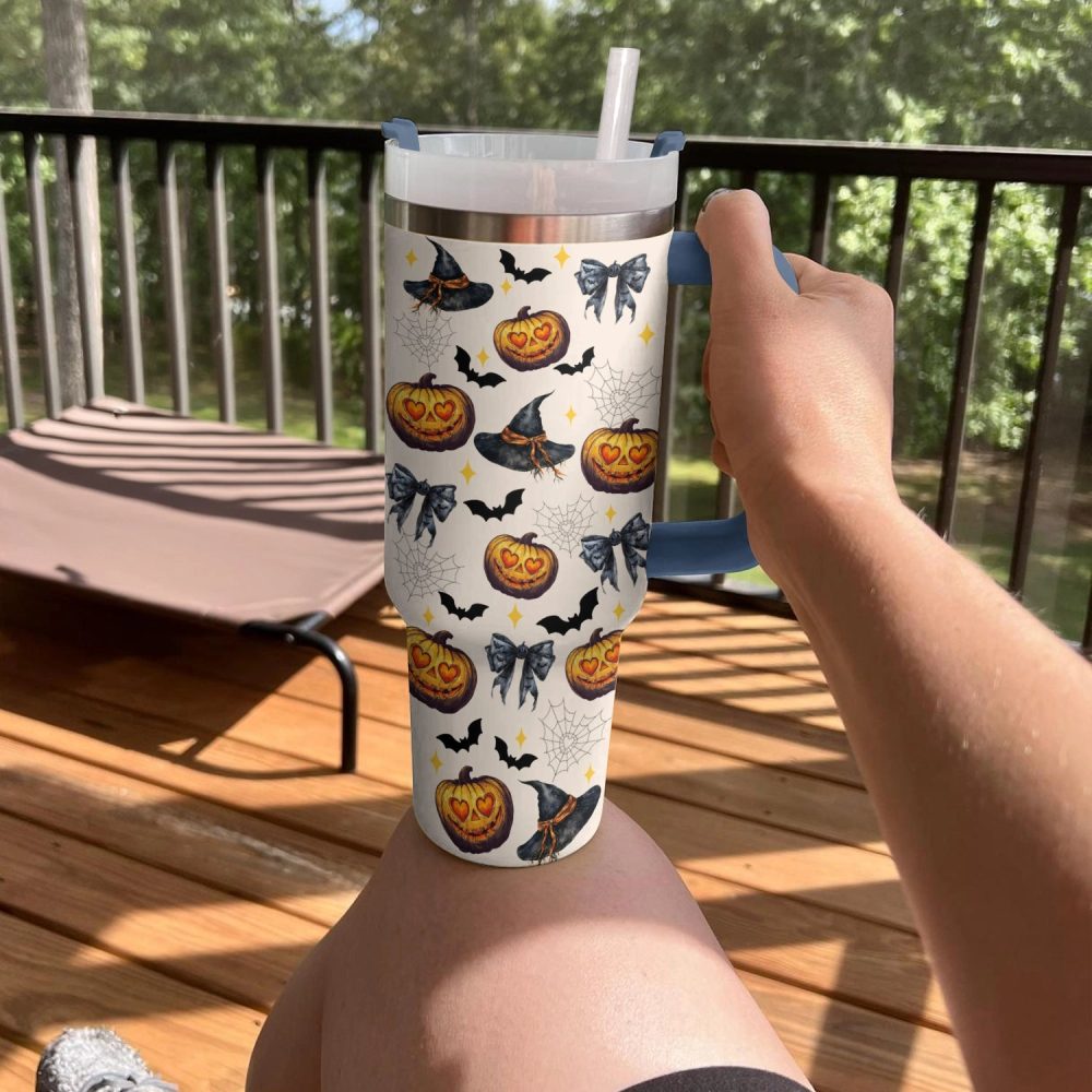 Details: Embrace the Halloween spirit with this spooky pumpkin-themed Custom Stanley Quencher tumbler! Made from durable stainless steel, this 40oz tumbler is perfect for keeping your hot cocoa warm while trick-or-treating or your iced brew cool while carving pumpkins. The easy-grip handle makes it convenient to carry around during spooky outdoor adventures in nature.