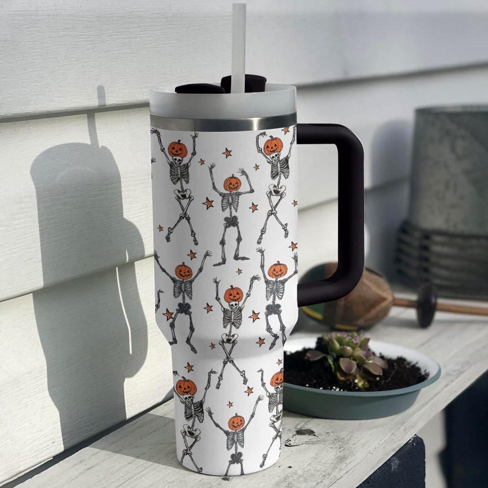 Details: Bring a touch of Halloween to your daily hydration routine with this spooky sipper Stanley Quencher stainless steel tumbler. Designed with a convenient handle for easy carrying brewing up your favorite beverage wherever you go.