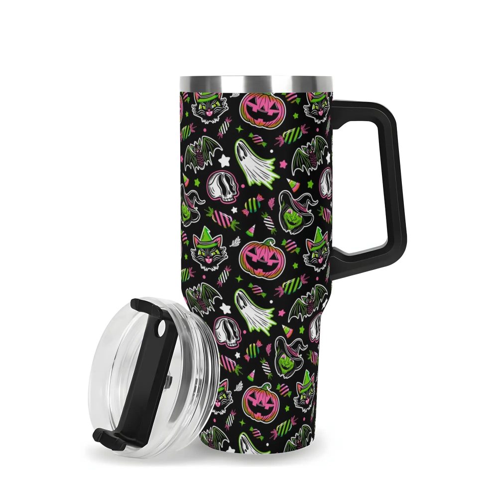 Details: Embrace the Halloween spirit with this spooky-themed Stanley Quencher 40oz stainless steel tumbler! Perfect for trick or treating or enjoying your favorite beverages by the bonfire, this tumbler features a secure handle for easy carrying and a durable construction to keep your drinks cold or hot for hours.