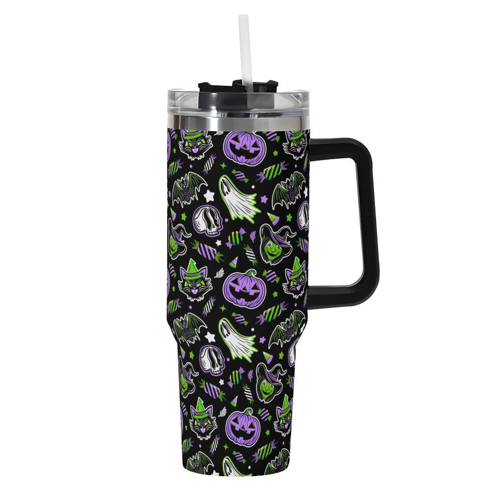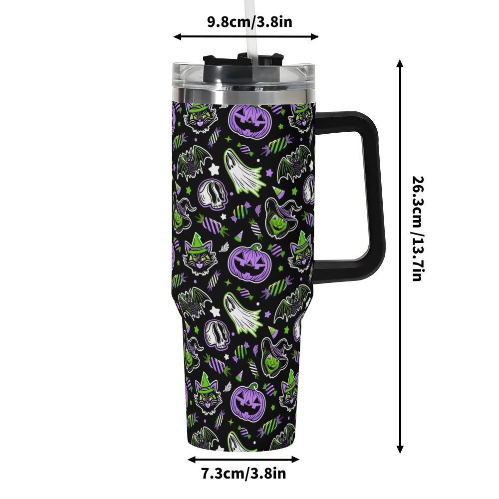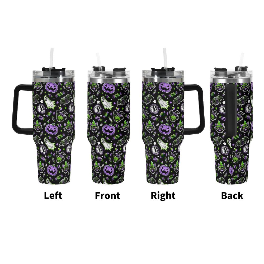 Details: Get into the Halloween spirit with this spooky custom Stanley Quencher 40oz stainless steel tumbler with handle. Perfect for trick or treating or enjoying a hot beverage on a cool autumn day, this durable tumbler features a Halloween-themed design guaranteed to add a touch of fun to your day.