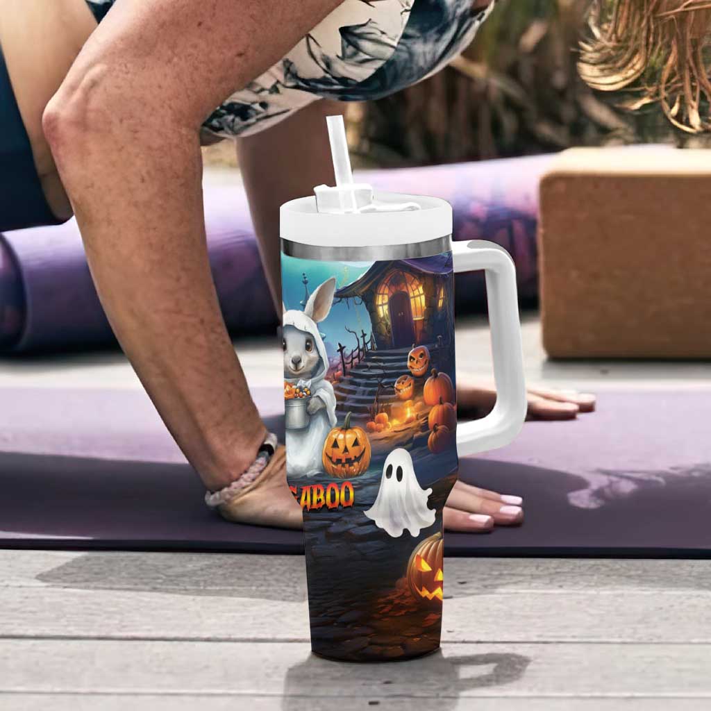 Details: Celebrate Halloween this year with our custom Stanley Quencher tumbler featuring a playful kangaroo in a spooky haunted house. Keep your drinks hot or cold with its durable stainless steel design. This tumbler is perfect for long hikes in the wilderness or spooky nights out trick-or-treating.
