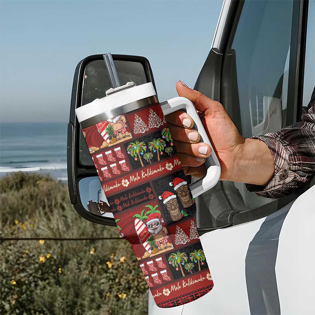Details: Get into the Hawaiian Christmas spirit with this special edition custom Stanley Quencher 40oz stainless steel tumbler with handle in black and red. Ideal for keeping your drinks hot or cold while enjoying the beautiful island holiday vibes, this tumbler is not only functional but also stylish. The Mele Kalikimaka design adds a festive touch to your drinkware collection.