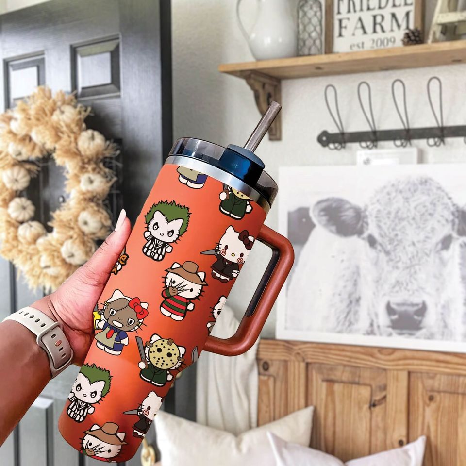 Details: This adorable Hello Kitty Cartoon Halloween Custom Stanley Quencher 40oz Stainless Steel Tumbler is not only a stylish and practical accessory, but also a great way to show off your love for nature. Made from durable stainless steel, this tumbler is perfect for keeping your beverages hot or cold on all of your outdoor adventures. Whether you’re camping, hiking, or just enjoying a day in the park, this tumbler will keep your drinks at the perfect temperature. Plus, the Halloween-themed Hello Kitty design adds a fun and festive touch to your drinkware collection. Cheers to nature and good company with this charming tumbler by your side.