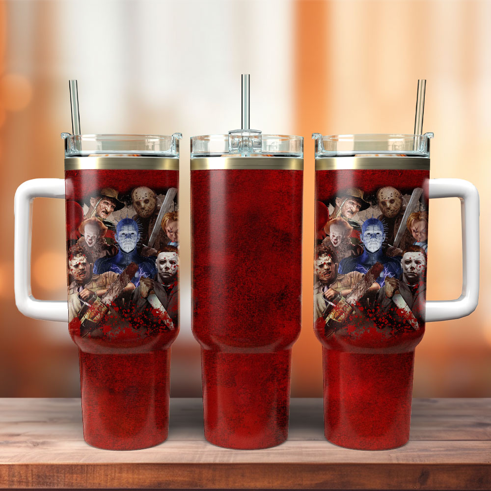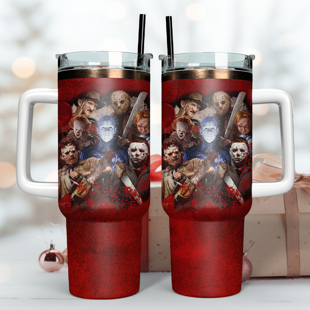 Details: Take sipping to a whole new level with this custom Stanley Quencher 40oz Stainless Steel Tumbler featuring iconic horror movie characters. This premium tumbler is designed to keep your drinks hot or cold for hours, perfect for your next outdoor adventure or movie marathon.