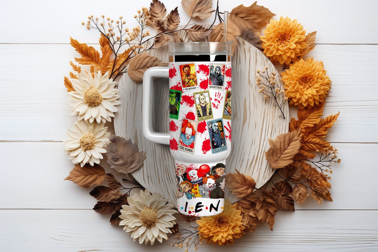 Details: Keep your beverages at the perfect temperature while showing off your love for horror movies with this custom Stanley Quencher 40oz stainless steel tumbler. Featuring iconic horror movie characters, this tumbler is perfect for staying hydrated on your next outdoor adventure.