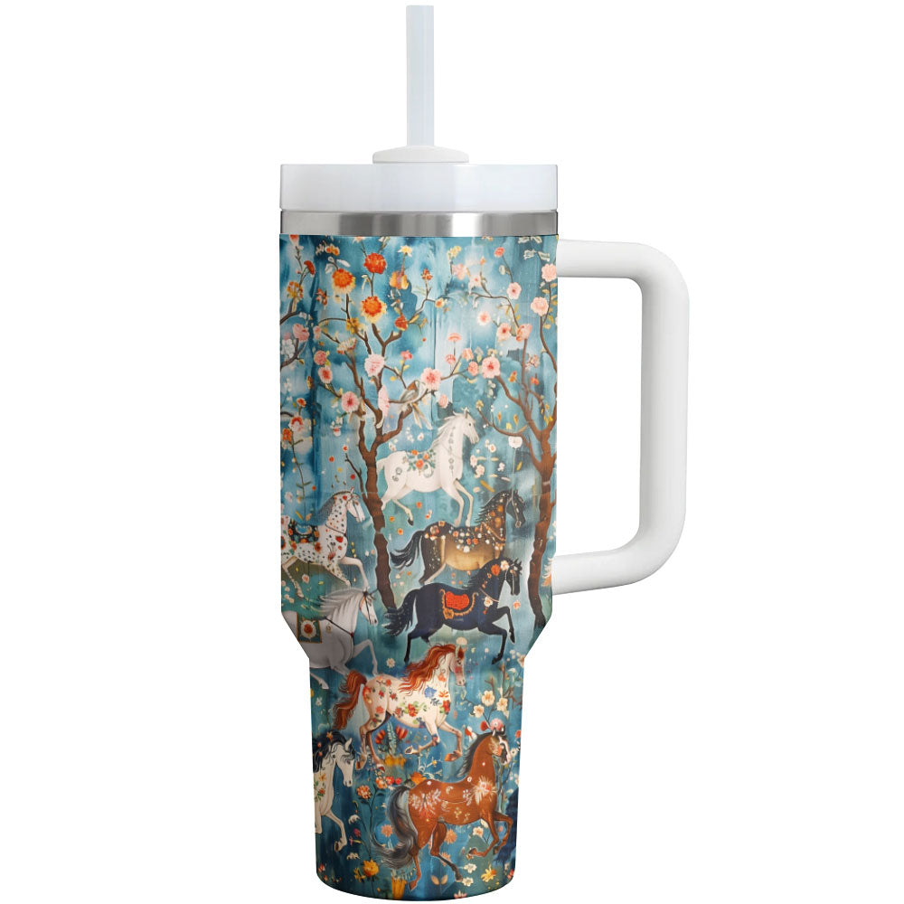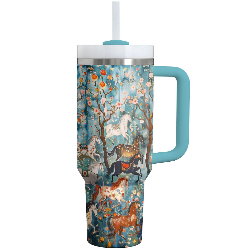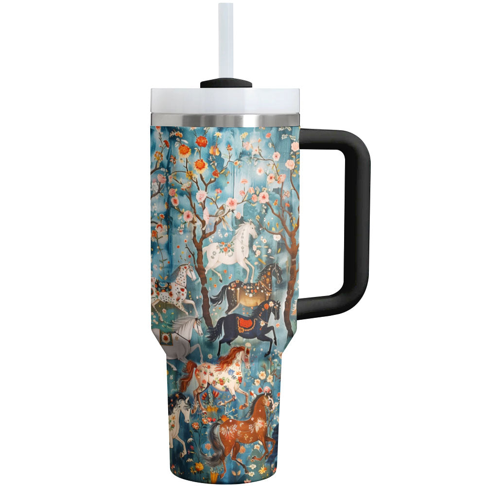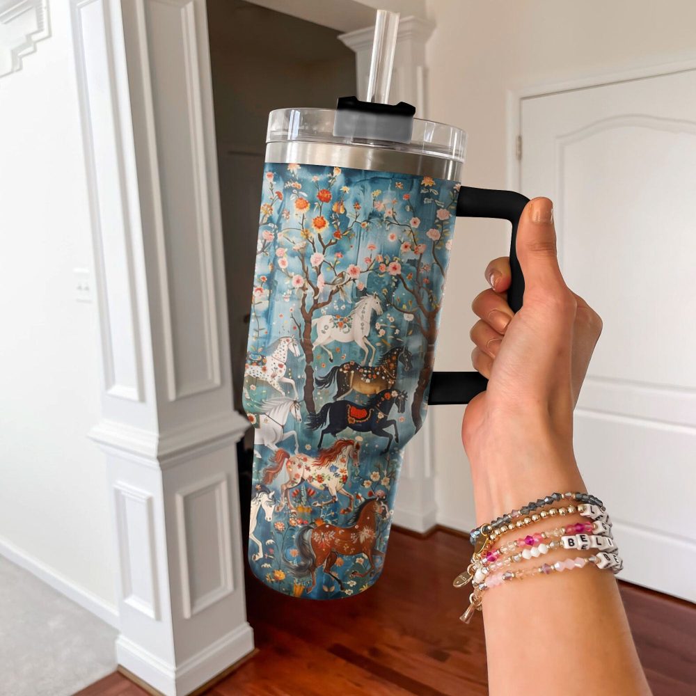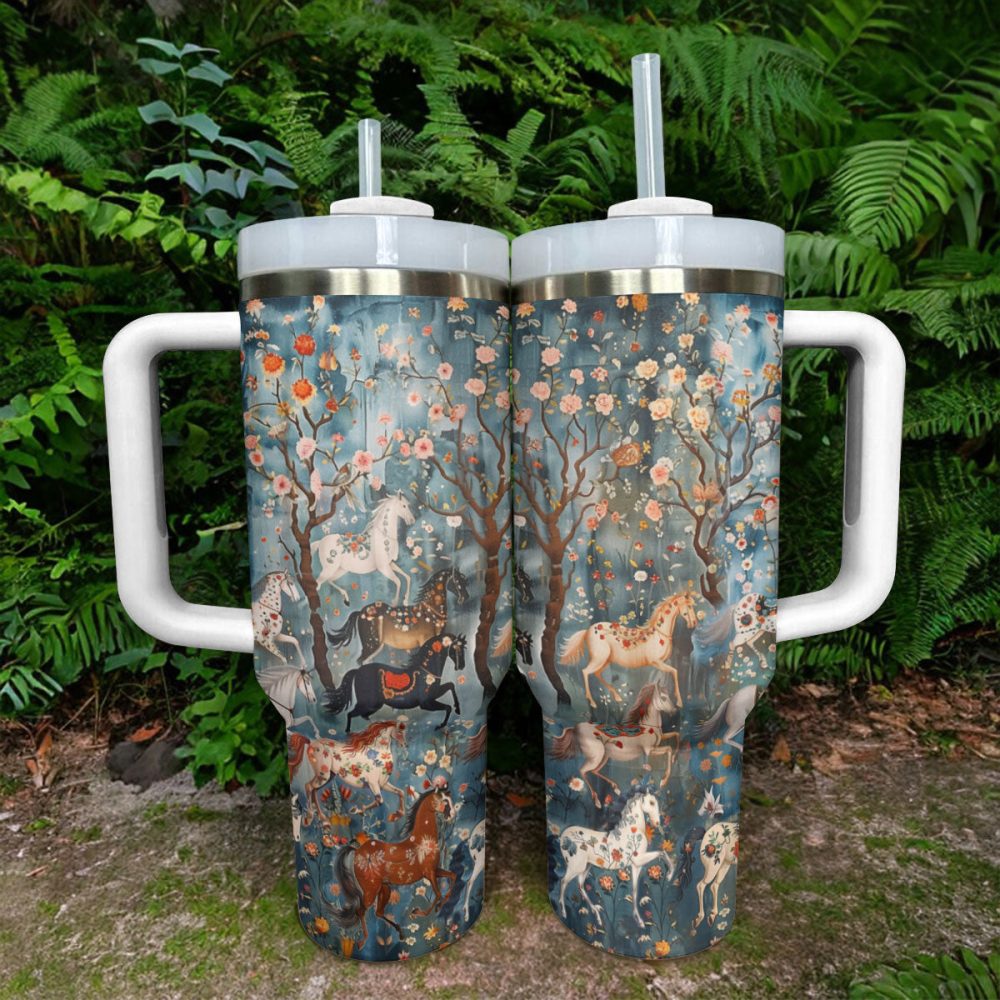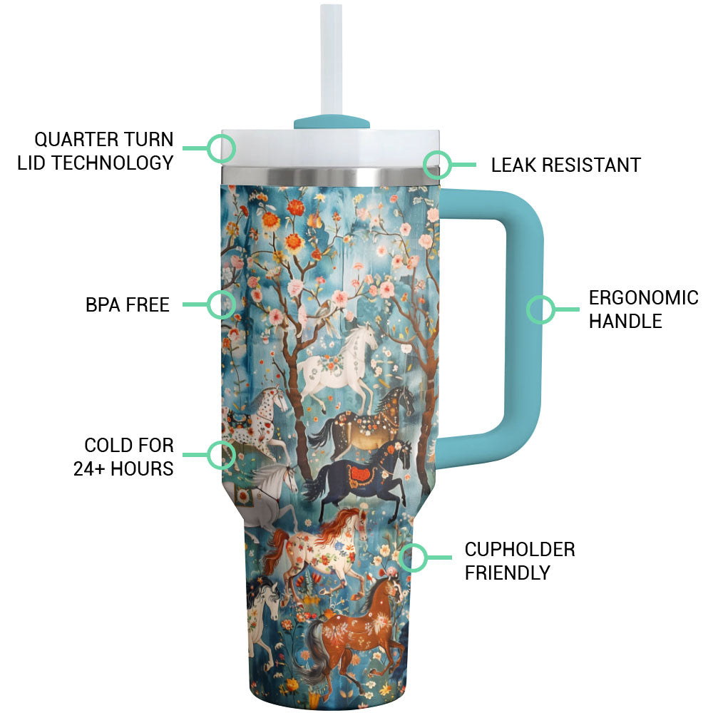 #rustic, #nature-inspired, #horse design, #stainless steel tumbler, #40oz capacity, #hot and cold insulation, #portable handle