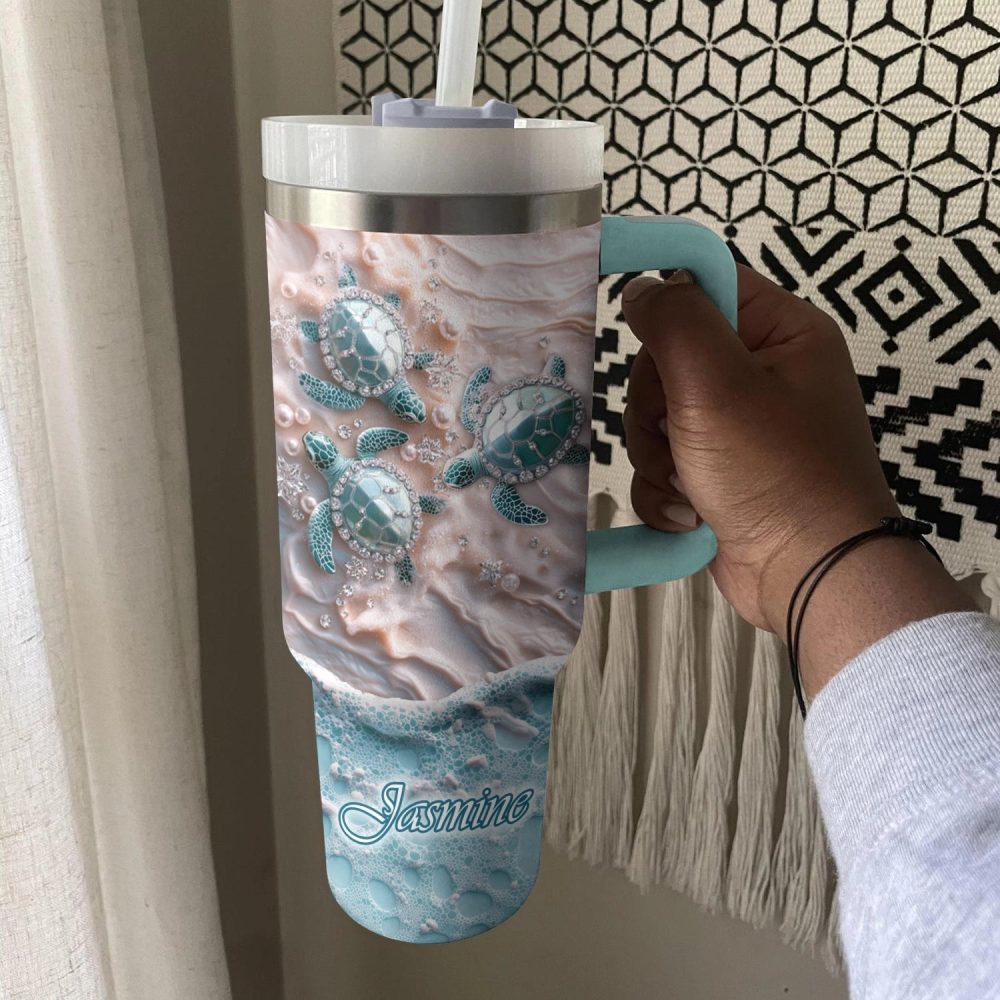 Details: Celebrate the mesmerizing beauty of nature with our Nautical Waves and Turtle Custom Stanley Quencher 40oz Stainless Steel Tumbler With Handle. This stylish and durable tumbler features a unique design inspired by ocean waves and sea turtles, perfect for nature lovers and anyone with a passion for the sea. With its sturdy handle and 40oz capacity, it is the ideal companion for your outdoor adventures and daily hydration needs.