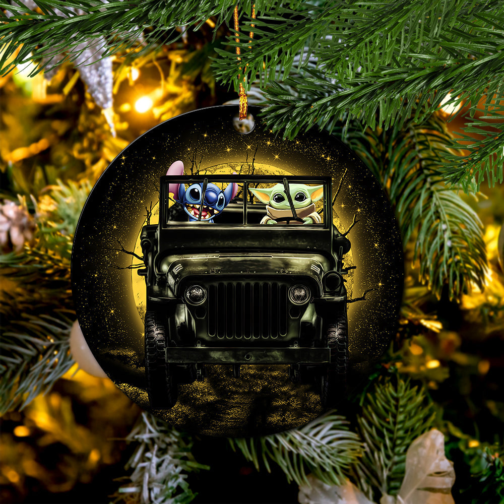 Be the first to review “Stitch And Baby Yoda Ride Jeep Moonlight Halloween Funny Ceramic Circle Ornament Perfect Gift For Christmas Holiday”