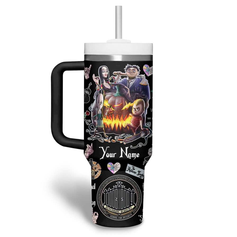 Details: Stay spooky while staying hydrated with The Addams Family Movies custom Stanley Quencher tumbler. Made with durable stainless steel, this 40oz tumbler features a convenient handle for easy carrying and sipping. The sleek design is perfect for fans of the iconic Addams Family movies.